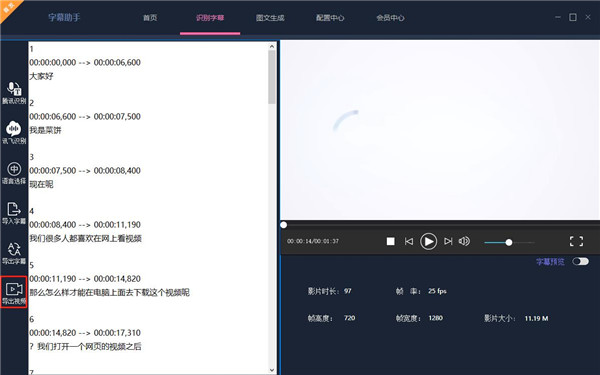 5、再点击腾讯识别或讯飞识别,识别视频中的语言转换成字幕