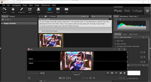 许多图像工具(如白平衡,曝光校正或非锐化蒙版)可用于增强图像。所有编辑步骤都是非破坏性的,因为只有单个工具设置存储在图像存档数据库中。这样,原始图像始终保持不变。