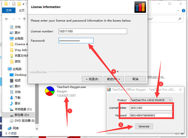 5、到了需要序列号的步骤后打开Crack文件夹内的“Teechart-Keygen.exe”选择“TeeChart Pro v2010 SOURCE”点击“generate”将获取的序列号粘贴复制到软件安装程序对应框框并点击“Next”。