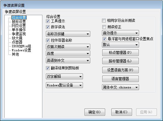 争渡读屏软件公益版是一款运行在Windows系统下的免费屏幕朗读软件,用于协助视力障碍人士操作电脑,软件拥有良好的系统兼容性、自动化的安装过程和丰富和完善的语音引擎,有了它就可以轻松浏览网页内容了,即使看不到也可以看到网络世界的各种热门新闻和多姿多彩。语音质量的好坏也直接影响着我们使用电脑的情绪,争渡读屏具有丰富且完善的语音引擎,可以满足用户不同的个性化需求。支持目前大多数主流的语音接口,支持双语音库混合朗读,可以选择不同的声卡切换输出。用户可以随意安装自己喜欢的语音库,并且可以进行任意的搭配使用。双语音混合朗读配合多国语言,可以实现任何双语文字的朗读,比如中英混读、中日混读,英中混读,日俄混读等。