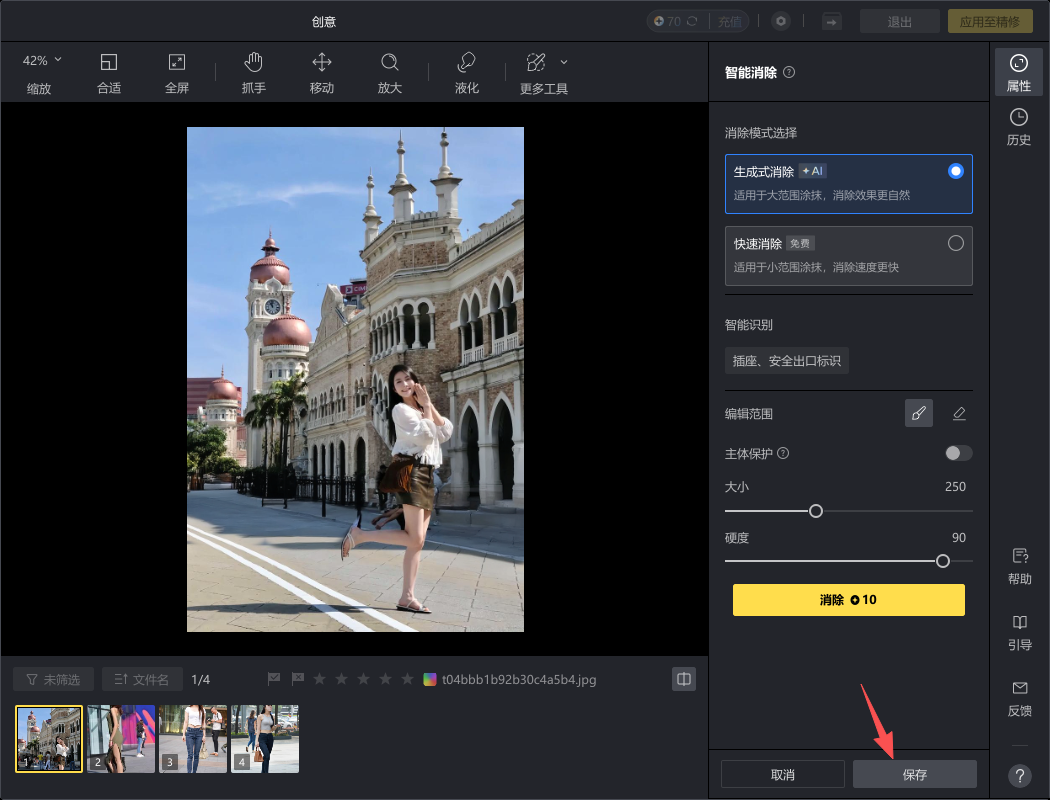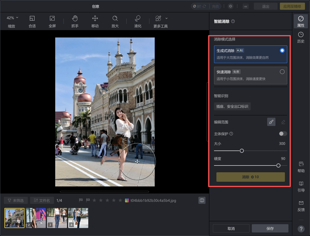 2、可以选择“生成式消除”或者“快速清除”,生成式会更加自然,快速清除会更加便捷快速,随后需要调整“大小”,“硬度”参数,对图像中的路人进行涂抹。