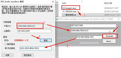 8、将注册码,以及手动激活代码复制到SRS Audio Sandbox的注册界面内,如下图所示,选择手动激活,再点击激活按钮即可