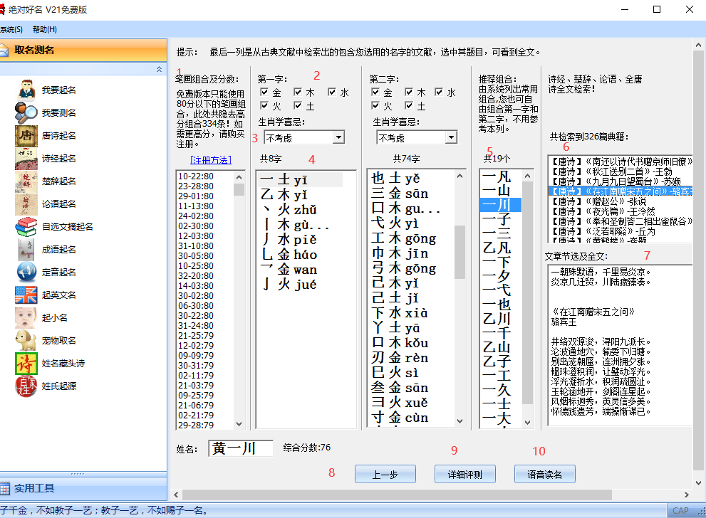 名字出现在图2-2-1的8)处时,即可点详细评测,查看对该名字的详细解释及分数。