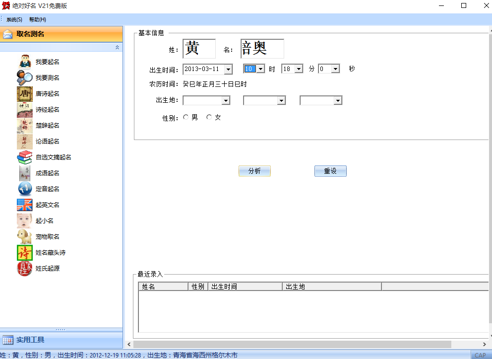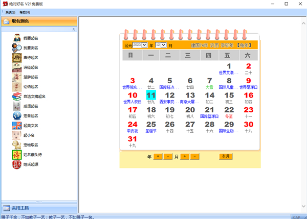 绝对好名起名软件是一款非常实用的取名工具。该软件按宝宝生辰八字喜用神,提供周易取名、姓名学、三才、五格、生肖、喜忌、音形意等多方面综合考虑,最适合宝宝命理。又音形意俱佳的高分吉名方案。绝对好名起名软件可以诗经起名、楚辞起名、唐诗起名、论语起名等,还有起英文名,出生天数计算等实用功能。名字有寓意更符合命理,给宝宝一个好的命局,让他赢在人生起跑线。绝对好名起名软件界面简单,操作符合用户习惯,各位父母不用去查字典,直接用绝对好名起名软件,给宝宝一个响亮的名字吧。