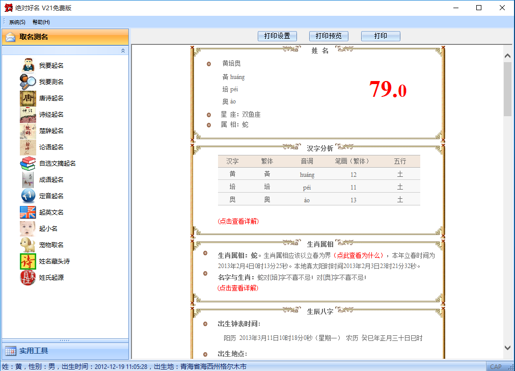 输入姓氏、名字、出生时间(阳历)、出生地、性别后,点【分析】,出现下图的姓名的详细评测页: