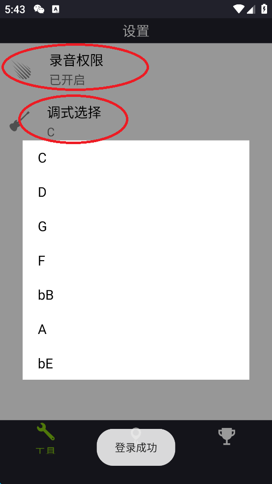 2、点击上方的“调式选择”,可以自由选择调式,随后就可以根据录入的声音调音。