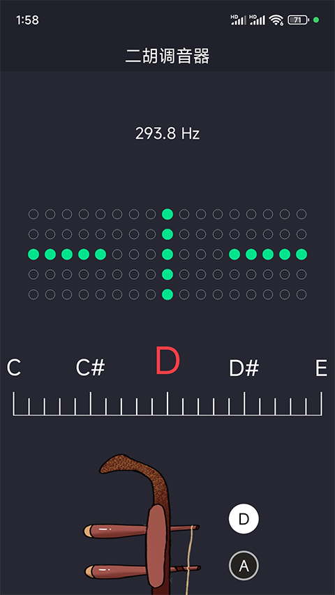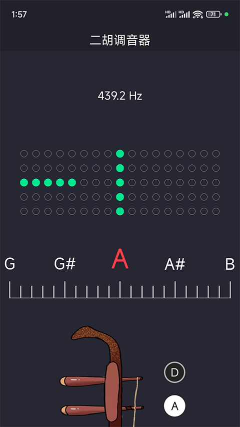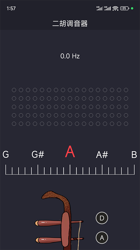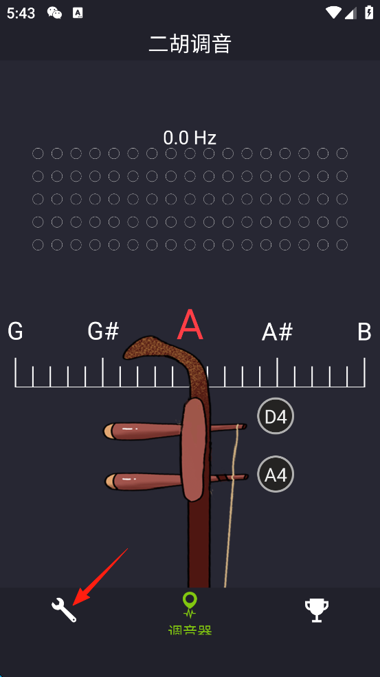 将外弦调成对应字母A,内弦调成对应字母D, 唱片和音名对照表 1、2、3、4、5、6、7、 C、D、E、F、G、A、B、 比如软件上显示了“G”,其实就是“5”这个音,这时候需要调高一点,拧紧一点,调成A。 1、点击屏幕左下方的“扳手”标识。