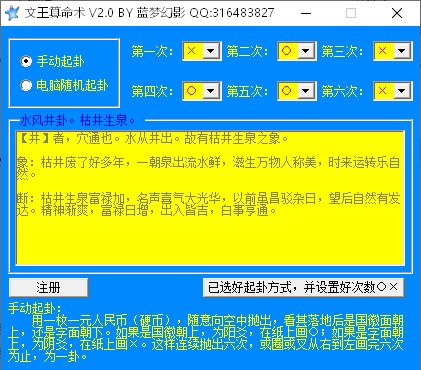 用一枚一元硬币,随意向空中抛出,看其落地后是国徽面朝上,还是字面朝下。如果是国徽朝上,为阳爻,在纸上画一圆圈;如果是字面朝上,为阴爻,在纸上画一叉。这样连续抛出六次,或圈或叉从右到左画完六次为止,为一卦。软件特色