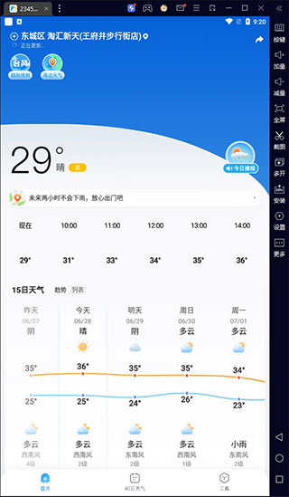2345天气预报电脑版是需要借助模拟器在电脑上运行的一款天气查询软件。软件支持全球四万+个城市及乡镇的天气查询,有着超过1.4亿用户,提供未来40日的天气预报,一键就能查询当前2小时内的天气变化以及变化趋势,为用户的生活中计划和决策提供重要参考。