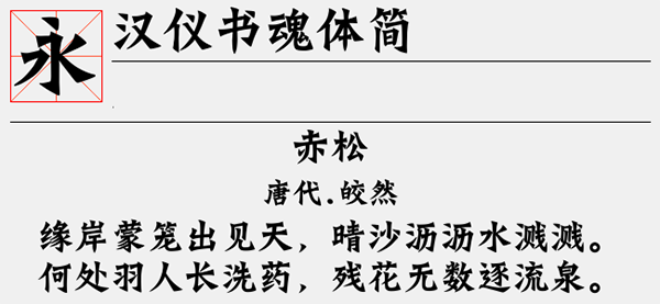汉仪书魂体简字体是一款赏心悦目、百看不厌的中文字体,字体有着飘逸的风格,透露着一股古风干练之美,文字造型细腻,有着大气磅礴之感。字体笔触较为粗实,字体线条灵动、潇洒,连笔张弛有度,具有很好的视觉感染力。可以很好的应用于文本装潢、信息展示、网页设计、篆刻制模、数据制作、装潢设计、计算艺术设计、视觉设计、字帖等一切合法应用场景,有喜欢的朋友可免费下载收藏。