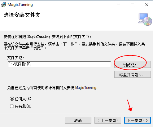 3、点击“浏览”可以将安装路径更改,勾选“任何人”方便日后使用程序