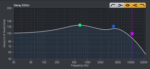 提供的 15 种早期反射模式是算法,实时计算并使用卷积应用。早期反射之后是密集且无共振的后期混响尾部,从而产生极具说服力的房间模拟,其深度令人印象深刻,并具有算法混响的灵活性。也许最重要的是两个图形均衡器,它们以时尚而熟悉的用户界面提供,只需单击和拖动控件即可。这些图形允许您调整与频率相关的衰减时间和主输出均衡器。衰减编辑器可以雕刻与频率相关的混响衰减,从而允许您夸大或降低混响尾部的频率。这在使用特定频率的乐器(如低音吉他或主唱)时非常理想,可根据您的音源自定义频率以优化保真度。主输出均衡器是使用大型乐器组甚至全混音时的理想选择,可将混响满足全频范围,以获得或多或少明显的频率。