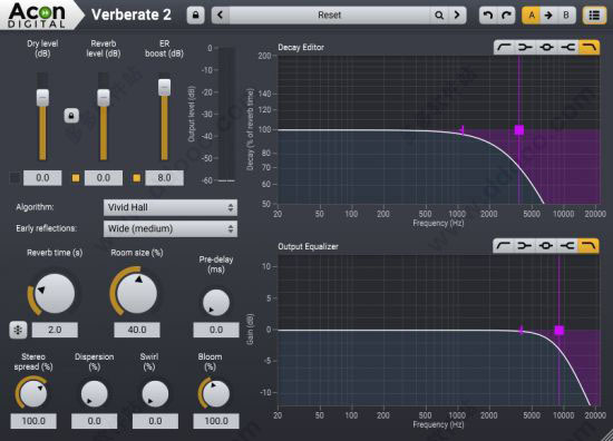 Acon Digital Verberate 2,简称Verberate2。这是一款适用于 Windows 和 Mac 的高度通用的卷积混响插件。内置大量独特的声音设计选项,当您需要在混音中为乐器添加深度、空间和特征时,Verberate 2有各种独特的真实声学空间以及精确的板模拟供您使用,可以提供您需要的每种混响风格,用来适应任何乐器。Verberate 2 的功能功能十分强大,可增强您的表演效果,并与源音无缝融合,带来无与伦比的细节和清晰度,再加上一套全面的功能来操纵和迎合您的混响,您将能够在脑海中找到声音,包括典型参数,如房间大小,混响时间等,以及两个高级图形表示,以调整整体输出EQ以及频率相关的混响衰减,并支持所有常见的环绕声和身临其境的格式,最高可达7.1.6通道。新的生动霍尔算法增加了时间变化,避免了困扰基于卷积的混响的刚度,同时保留了Verberate Surround 1的自然高密度混响尾音。希望可以帮助到大家,欢迎下载支持!