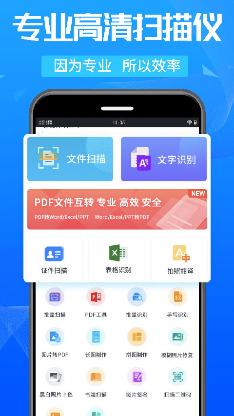 1、【文字识别】 自动识别、提取图片文字 ,解析信息;快速进行文字提取,然后自动图片转文字,支持word和txt文档导出分享。 2、【表格识别】 拍摄表格图片,智能解析表格文字,快速生成Excel表格文件,下载或分享Excel表格,快捷方便,一步到位! 3、【扫描仪】 对文档进行扫描和批量扫描,自动智能裁剪,可保存PDF分享,您的移动扫描仪,扫描效果媲美千元扫描仪。 4、【手写识别】 通过高精度自动抓取文字信息,它可对您的手写文档进行文字扫描提取,可以直接进行文字识别。 5、【拍照翻译】 对图片进行快速翻译,支持中、英、日、法、德、西班牙、葡萄牙、意大利、俄等等多国语言。 6、【护照扫描】 拍摄护照,自动提取护照上的文字,快速排版后返回您所需要的信息。 7、【文件库】 您还可以将它当做您的文件库,存储和整理您的文档,以备不时之需。 8、【身份证扫描】 拍摄身份证,自动1:1适配到A4纸上,支持自定义添加水印软件亮点