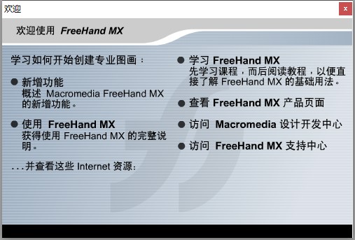 新增了解答面板,可从中即时访问 互联网上的FreeHand 支持中心。FreeHand MX 包含解答面板,这是所有 Macromedia MX 应用程序的标准功能。