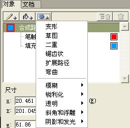 运用 FreeHand MX 对象面板,不仅能够以集中方式快速检查和更改对象属性,也可以使用对象面板来更改属性的堆叠顺序。(联想丰富的话,想想AI的Appearance面板…)