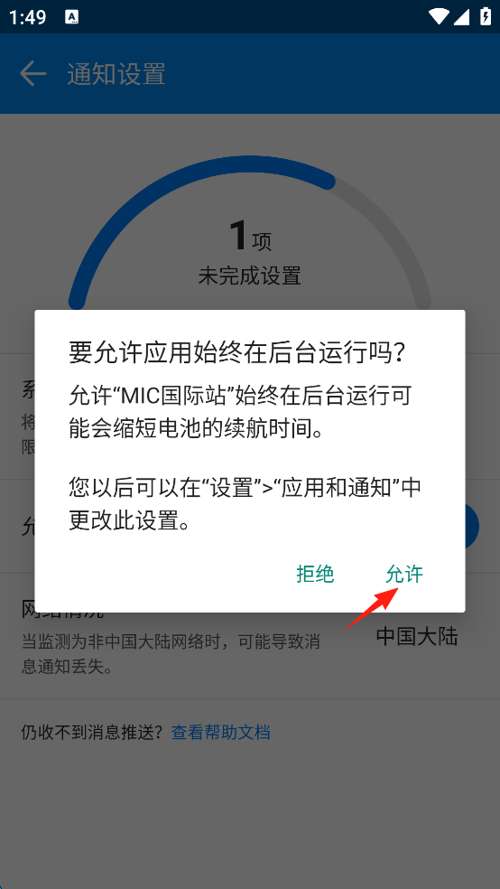4、点击“允许应用到后台运行”右侧的“立即开启”。