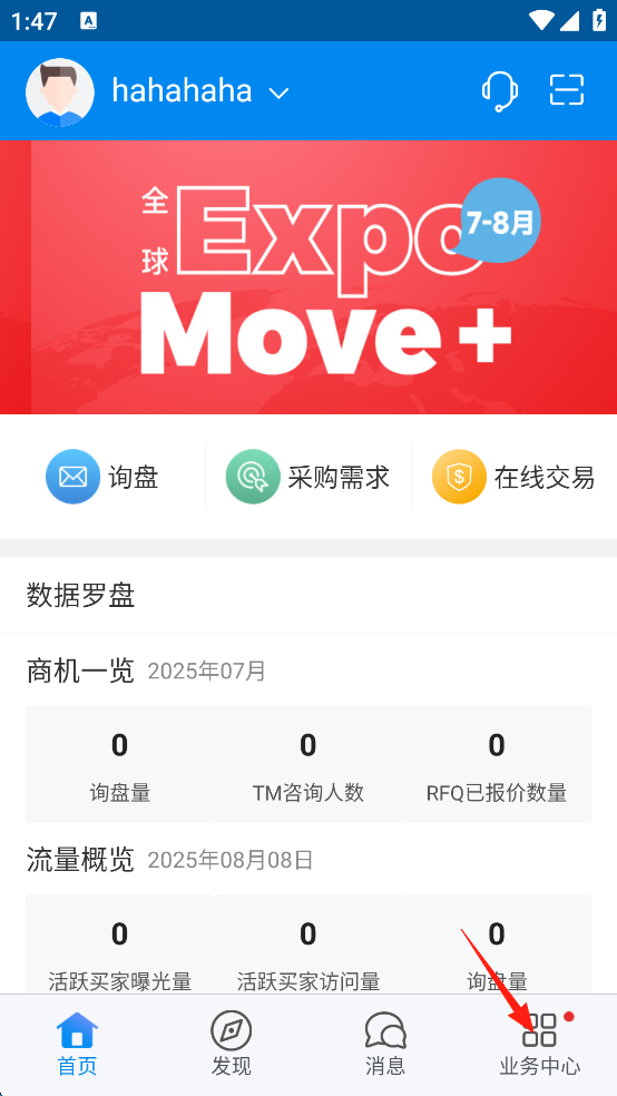 1、该软件默认后台关闭,所以需要打开所有的通知,点击屏幕右下角的“业务中心”。