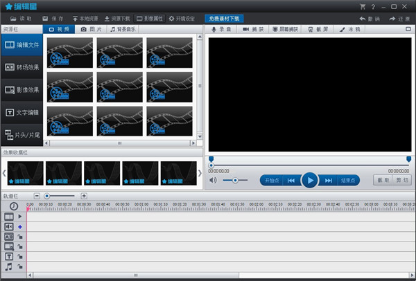 1、轻松剪辑视频、音频文件。用鼠标即可完成影像效果,素材文件的拖拽添加、移动、复制、粘贴。2、自由插入和重叠使用各种转场效果、影像效果、文字效果、背景音乐及录音。用鼠标轻松进行效果重叠,帮您做无限原创视频。