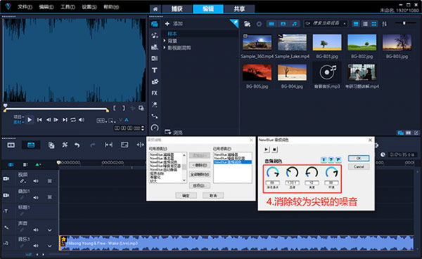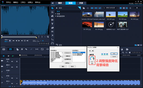 1、会声会影2023拥有28款预置音频滤镜,支持为同一音频添加多个音频滤镜的操作,且每个音频滤镜都拥有其独立的滤镜设置界面。我们可以通过NewBlue减噪器、NewBlue噪音渐变器、NewBlue音频润色,这三个滤镜来消除素材中的噪音。