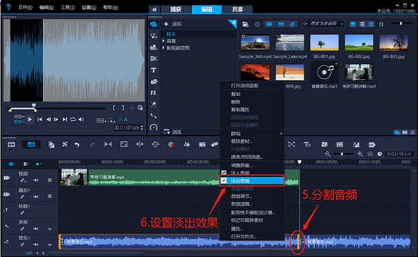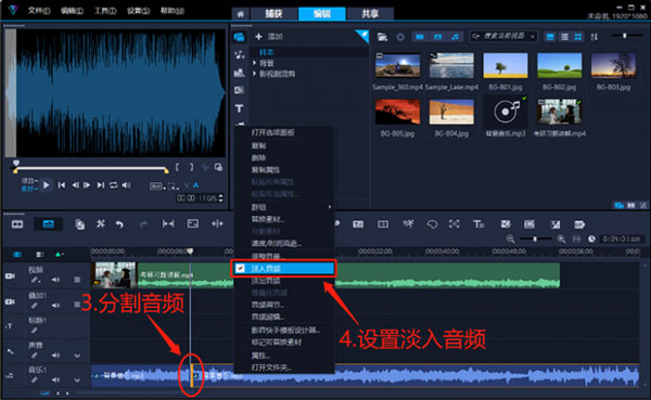 为了避免背景音乐的出现显得过于突兀,很多时候我们需要为分割好的音乐素材设置淡入效果。所以只要右击分割好的音乐素材并点击“淡入音频”,即可为背景音乐设置一个音量渐渐显现的效果。