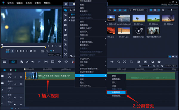 1、将视频素材插入会声会影2023,右击素材选择“分离音频”。
