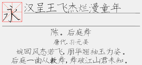 汉呈王飞杰烂漫童年字体是非常好看的手写字体,该字体如同其名字一般,第一眼看上去就十分的天真童趣,一笔一划随心所欲散漫任性,但给人天真的童年感,也是非常不错的字体。字体的角度、大小、距离都设计得非常恰当,整体效果极佳,可以很好的应用于文本装潢、信息展示、网页设计、篆刻制模、数据制作、装潢设计、计算艺术设计、视觉设计、字帖等一切合法应用场景,有喜欢的朋友可免费下载收藏。