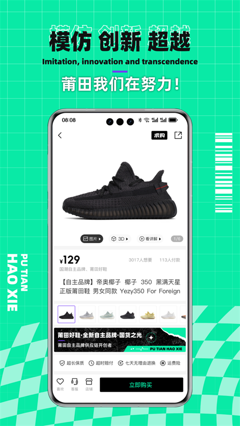 1、自主品牌供应链开创者 聚集莆田全部自主品牌鞋类产品、严格把控、只许莆田鞋企入驻、保证每双鞋子都是由莆田生产、超长质保一个月、品质保障、发货统一包装、质检。 在这里可以获得购买莆田鞋货源渠道的专业推荐、实体店、电商、外贸、下单生产可与厂家直接对接、消费保证、品质把控、售后无忧。 2、3D沉浸式体验 实时运动鞋收录,努力做莆田自主品牌、莆田鞋的百科、每天持续上架几十个鞋款、更有高清图片、穿搭视频、3D全息空间为用户打造不一样的沉浸式体验、此外还精心收录服饰、数码、美妆、箱包、手表等,筛选你喜爱的型号,放心购买。更新日志