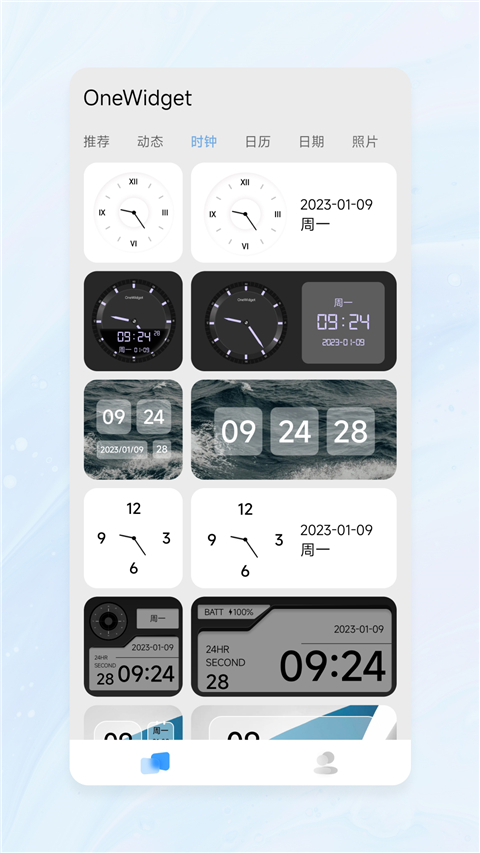 1、在本站下载安装并打开OneWidget软件,进入软件首页,为用户提供过很多不同的桌面小组件,用户可以选择自己喜欢的进行添加。