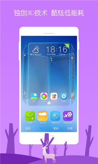 1、清爽界面:清爽精致的界面,给你舒适清爽的视觉盛宴 2、海量精美主题:海量在线主题,精美个性的壁纸、锁屏,给你豪华视觉体验 3、酷炫3D桌面:全新3D桌面,酷炫的界面,给你前所未有的炫酷体验 4、预览主题:壁纸更便捷隆重推出主题、壁纸和锁屏的预览,更加便捷,完美桌面随心替换软件优势