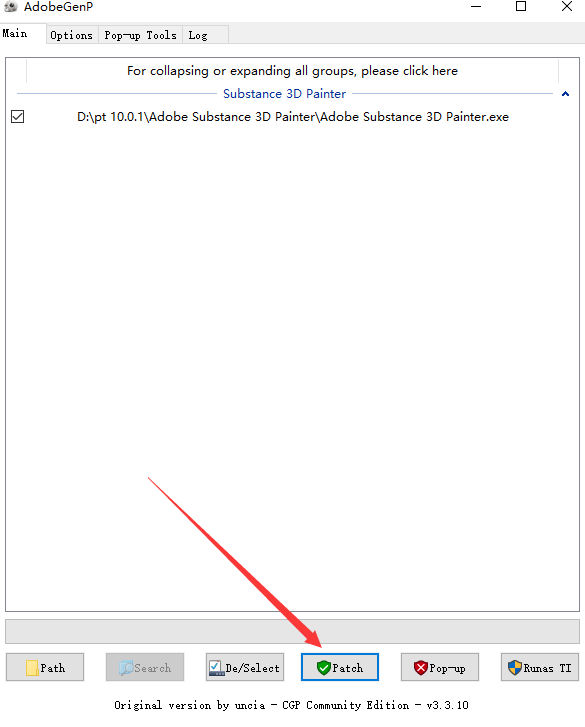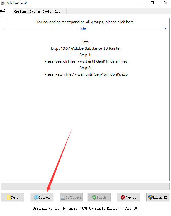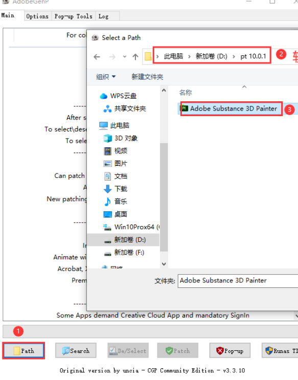 3、点击【Path】,弹出对话框,找到软件安装目录位置,选择Adobe Substance 3D Painter打开,点击【Search】开始搜索文件