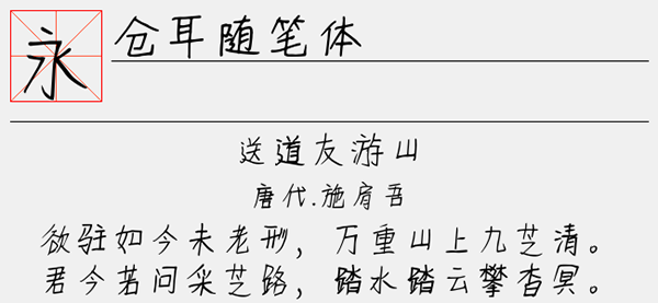 仓耳随笔体字体是一款赏心悦目、百看不厌的中文字体,字迹清晰而沉稳,如时光般的透彻与可贵,给人一份慵懒而认真的生活态度体验,让文字拥有自己的灵魂。同时笔画书写果敢有力,字体结构灵活、变化丰富,整体风格潇洒自然,更接近现代人的生活与个性,书写效果给人人赏心悦目的感觉。可以很好的应用于文本装潢、信息展示、网页设计、篆刻制模、数据制作、装潢设计、计算艺术设计、视觉设计、字帖等一切合法应用场景,有喜欢的朋友可免费下载收藏。