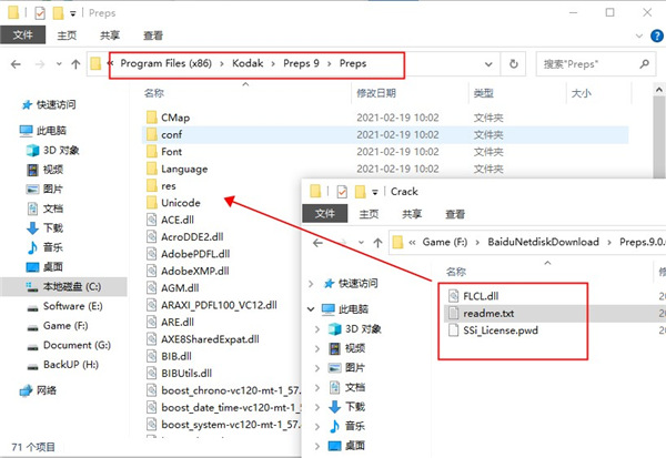 4、安装完成,退出向导,将crack中的内容复制到安装目录中,默认C:\Program Files (x86)\Kodak\Preps 9\Preps\中,点击替换目标中的文件