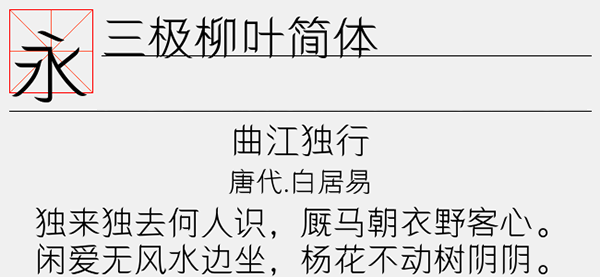 三极柳叶简体字体是是由三极字库全新推出的艺术字体,字体整体风格轻巧简洁,笔画飘逸、平直,粗细匀称,完美的将细柳的特点刻画出来。视觉效果字体方正稳健又有柳叶的飘荡动感,节奏感明显,实用性强。三极柳叶简体字体品适用于印刷媒介的标题与正文排版、各类屏幕显示及影视字幕等。也适用于报纸、杂志、书籍、广告、标志、宣传册、空间导视、包装、影视、游戏、交互设计等媒介,有需要的用户快来免费下载体验吧。