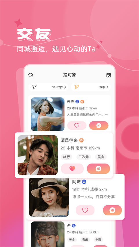 捡对象,每天牵手一万对。(牵手:沟通后互相有好感并交换了联系方式) 捡对象,聊天免费,脱单必备的短视频婚恋软件。 千万优良单身男女的聊天交友、相亲征婚平台。 在这里,您可以与同城单身美女帅哥们在线聊天,互相好感喜欢,趣味语音互动,视频交友约会,姻缘树下求姻缘,还能24小时抛绣球噢。软件特色