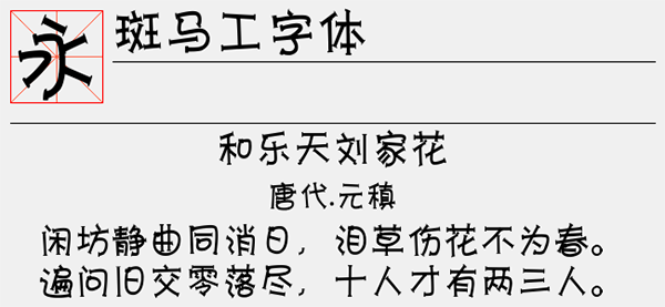 斑马工字体是斑马字库推出的一款个性而又有特色的字体,工字风格形象,每一笔每一划都有工字的效果,超级有意思。该字体笔画看上去有点粗,字形非常的行云流水,字体的角度、大小、距离都设计得非常恰当,整体效果极佳。可以很好的应用于文本装潢、信息展示、网页设计、篆刻制模、数据制作、装潢设计、计算艺术设计、视觉设计、字帖等一切合法应用场景,有喜欢的朋友可免费下载收藏。
