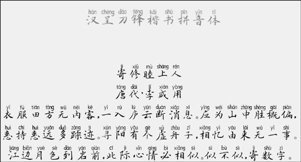 汉呈刀锋楷书拼音体是一款赏心悦目、百看不厌的拼音中文字体,同时也是由汉呈字库倾情发布的作品,字体字型凸显了端正、工整、简洁、清秀等特点,给人清新脱俗之感,适应于报纸和杂志和书籍中常用字体海报、个性促进品牌标志设计、字体设计、文本装潢、信息展示、篆刻制模英文、数据制作、装潢设计、视觉设计、字帖等一切合法应用场景,有喜欢的朋友可免费下载收藏。