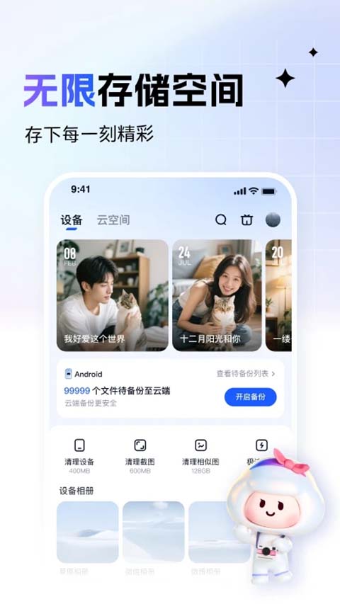 1、无限存储空间:你可以无限量以原画质备份照片与视频,切换任意手机设备都能访问这些内容。开启自动备份,美好回忆不丢失,还可以选择从手机本地导入照片视频。 2、批量下载内容:存储在一刻相册云端的照片和视频可以一键下载至你的智能设备中,高速下载,随取随用。 3、清理手机空间:使用小度AI助理可以一键清理手机内的相似图、手机截图和本地图片视频。只需轻轻一按,已安全备份的照片即可从你设备的存储空间中移除,保持手机清爽不卡顿、再也不用担心手机内存不足了。 4、智能共享相册:你可以创建相册并邀请朋友共享;创建相册时添加人物,完成备份后会自动将他们的照片添加到相册,无需手动操作。 5、图片智能搜索:输入图片元素或场景(身份证、截图、自拍、动图……),一键查找相关内容,快速锁定你所需要的图片。 6、本地照片智能分类:无需备份,即可体验智能化地点、视频、动图分类 。更有AI场景识别自动筛选人物、动物、风光、食物等海量事物场景。 7、给回忆以新意:一刻相册会根据你拍摄的优质内容自动推荐生成创意照片、卡点视频。你也可以使用像素风格、油画大师功能,为你定制专属像素头像、照片秒变油画风格,让你变身艺术大师。 8、分享美好时刻:「看见」社区话题广场,自动推荐你喜爱的话题。在这里你可以向千万网友分享你的生活,生活里的每个小点滴在都可以成为高光时刻。 9、积分兑换现金:参与每日签到、邀请好友等环节都有机会获得积分奖励,积分可以兑换现金、随心卡会员等礼品。模板简介