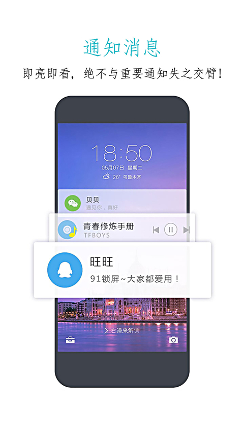 1、【通知消息】 锁屏界面即可快速查看消息,绝不与重要通知失之交臂。 2、【隐私保护】 密码&密保保驾护航,妈妈再也用担心我的手机被偷看啦。 3、【缤纷色彩】 密码、快捷面板样式随心变,每天给你不同的彩色心情。 4、【音乐控制】 便捷音乐控制开关,不用解锁便能畅享音乐。 5、【便捷操作】 无需解锁即可使用手电筒、计算器、闹钟等便捷功能。软件优势