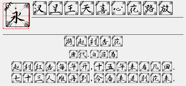 汉呈王天喜心花路放字体是一款非常有创意的中文字体,它全体规划规矩大方、字体粗细均匀、形象漂亮。笔触写得很流畅,形状很方正,看起来很传统且正规,并它还有一点点装饰,其字体的整体形象设计得非常恰当,整体效果极佳。可以很好的应用于文本装潢、信息展示、网页设计、篆刻制模、数据制作、装潢设计、计算艺术设计、视觉设计、字帖等一切合法应用场景,有喜欢的朋友可免费下载收藏。
