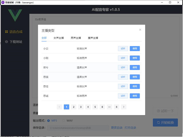 AI配音专家是一款功能强大的配音软件,软件为用户提供文字转语音的功能,能够帮助用户将所需的文字转换为语音朗读效果,软件功能强大,包含多种不同的声音,用户可以根据需求选择声音效果,采用阿里语音合成引擎,支持Windows设备,完全免费提供给用户使用,非常方便实用。AI配音专家支持男声、女声、童声等多种声音类型,能够帮助用户轻松合成各种声线的配音,软件采用了阿里语音合成引擎,语音种类齐全合成效率高,满足用户的各种配音合成功能需求;AI配音专家还内置多种不同类型的语音,在选择语音类型前可进行试听,满意后再进行使用,除此之外还可添加背景音乐,音量、语速、背景音量都可自由调节。
