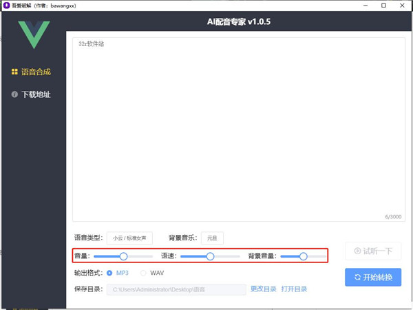 5、可设置合成语音的音量、语速以及背景音量,自由进行选择