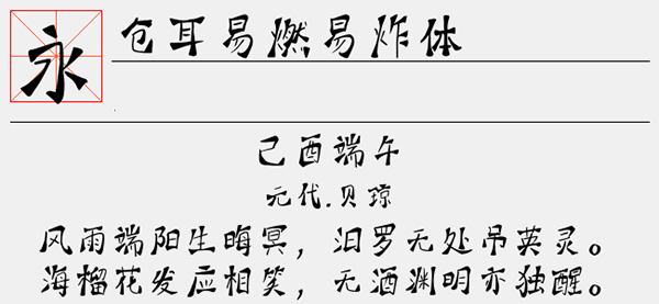 仓耳易燃易炸体字体是仓耳字库推出的一款中文字体,这款字体为了突出其艺术风格,将字体的笔画粗细在传统的书法基础上变得更加夸张,粗细对比明显,字体在结构上相对紧凑,使字体区别于同类字形,具有独特的艺术风格。并且选用软笔书写而成,在传统书法的基础上让字体的笔画粗细变化更加夸张,使字体的艺术风格更加明显,夸张独特。可以很好的应用于文本装潢、信息展示、网页设计、篆刻制模、数据制作、装潢设计、计算艺术设计、视觉设计、字帖等一切合法应用场景,有喜欢的朋友可免费下载收藏。