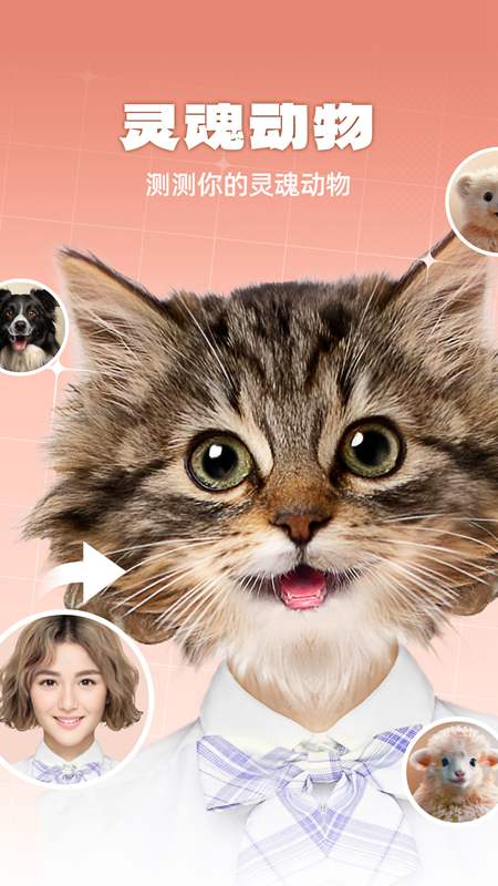 1、拍照相机 软件中为用户提供有拍照相机功能,可以为用户拍摄好看的照片。 2、灵魂动物 用户可以在线测一测自己的灵魂动物,让你可以找到适合自己的灵魂动物。 3、时光穿梭机 提供有时光穿梭机可以让用户穿越未来和过去,查看自己年轻时候或老了时候的样子。 4、笑容制造 使用到笑容制造工具时可以让用户将自己照片中的人物笑容制造的更加灿烂明媚。 5、卡通形象 用户可以选择到卡通形象特效来进行使用,将你的照片生成卡通形象内容。 6、一键保存 用户在完成照片的拍摄以及编辑制作后就可以将照片内容进行一键保存。灵魂宠物动物变脸相机怎么用?