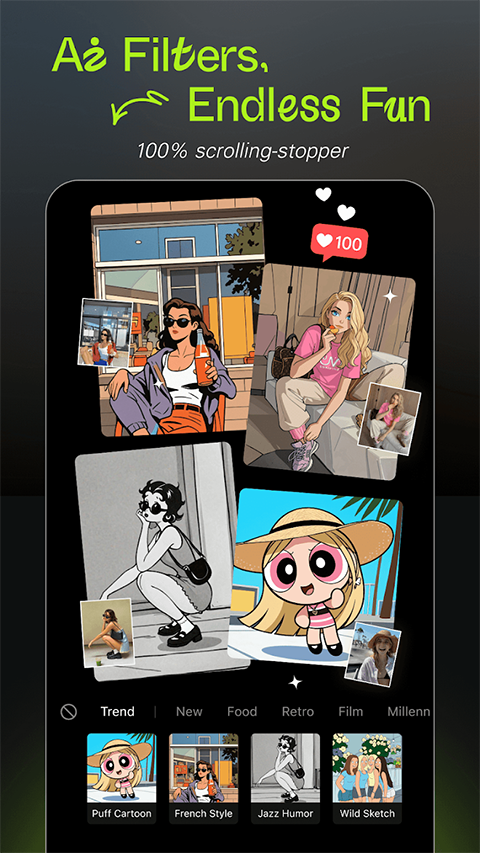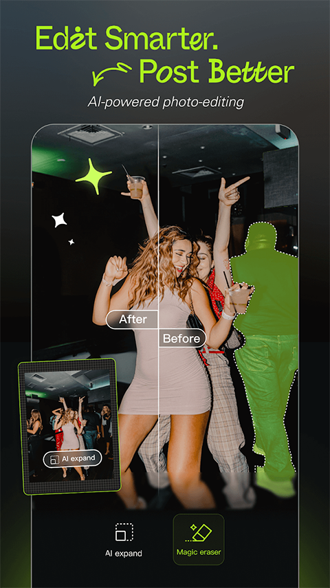 1、全功能照片编辑器 - AI清理:只需一次点击即可擦除照片背景。使用人工智能,平滑地移除图像中任何不需要的对象。 - AI照片质量增强:让AI毫不费力地增强照片质量,让您的照片更清晰。 - AI Cutout:通过自动识别对象并允许精确调整来移除照片背景。 -批量编辑:编辑同一风格的多张照片,节省编辑时间。只需点击一下,就可以将它们分享给抖音。 -拼贴和叠加:探索各种拼贴风格,为您的照片增添艺术气息。通过混合模式叠加图像,释放无穷的创造力。 -视频缩略图编辑:使用人工智能扩展和专业模板,通过创建诱人的缩略图来增强您的CapCut病毒式视频编辑。 -基本照片编辑功能:翻转、裁剪、调整照片亮度、饱和度和HSL。 2、艺术和自然的肖像编辑 -人工智能《阿凡达》:使用人工智能生成的照片,只需上传一张照片,就可以看到你的另一面。 -人工智能滤镜:尝试不同的人工智能滤镜,以不同的审美方式来看待自己,如漫画、赛博朋克、复古、卡通、PS2风格。你还可以为你的宠物获得个性化的AI头像。 - AI修图:一键体验AI的魔力,改变发型,尝试新的发色,通过调整笑容让照片更加生动。 -妆容:只需轻轻一拍,就能涂上最适合自己的妆容。 -修饰工具:多种修饰工具可以对您的自拍的各个方面进行自然和精确的调整,包括平滑皮肤、面部调整、身体调整和造型。 3、美学效果和滤镜 -时尚效果:通过应用诸如模糊、工作室光线、KIRA、复古和DV(cap cut也有)等酷炫效果,让您的照片变得时尚!) -使用长时间曝光效果为照片添加光彩照人的效果。 -使用Lofi效果捕捉照片中的复古氛围。 -最热门的滤镜:使用复古、电影、数码相机、plolarrid和夜景滤镜提升您的图片。 -您还可以叠加多种效果和滤镜来创建您喜欢的个性化图片。 4、模板、字体和贴纸 -使用美观的模板和数百种设计师设计的艺术字体和贴纸,只需点击一下,即可让您的照片充满艺术气息。 -各种场景的模板:抖音、Instagram、自拍、情侣、自然、美食、庆典、壁纸等。与最新的图像和短视频趋势、CapCut趋势、模因等保持同步。更新日志