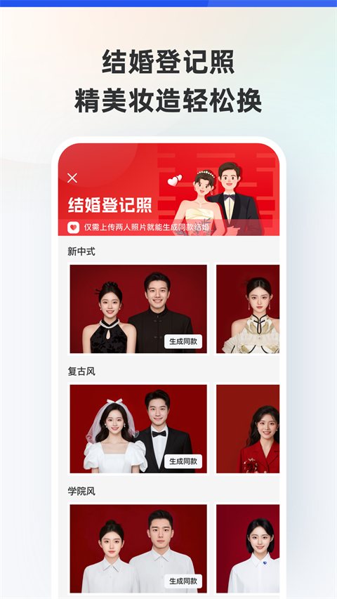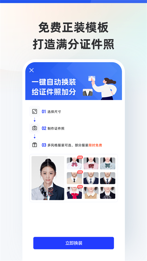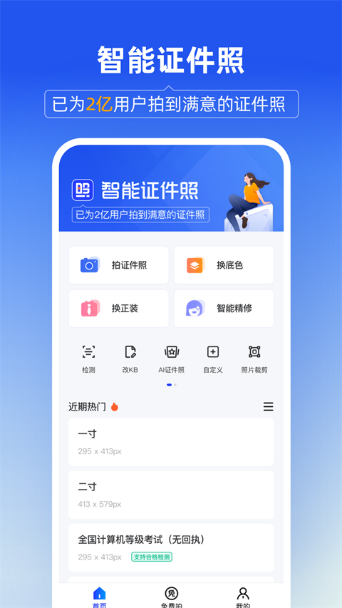【海量专业尺寸任选,支持自定义尺寸】 不论是常规一寸二寸、大一寸,小二寸等日常寸照尺寸,还说学生证、信息采集照片、简历证、驾驶证,或各类考试证件照都能满足。公务员考试、研究生报考、教师资格证、会计资格证报考、计算机等级考试、英语四六级等考试报名证件照。同时还可以自定义尺寸、像素和大小,证件照的使用场景都可以满足。 【智能AI精准抠图,一键换底色换服装】 专业人像算法抠图加持,让ps小白轻松上手。各类标准正装以及校园风格的服饰,打造在线极速换装。除红、蓝、白等常用颜色外,还有渐变蓝、渐变灰等高级底色。在线一键换装换底色,轻松制作电子版纸质版证件照 【手动美颜更自然,精致妆容更高级】 A可手动调节美颜程度,让证件照更加还原真实的自己,告别证照不美时代 【冲印包邮到家,足不出户get纸质照】 提供多种方式证照保存方式,流程简单易操作,包邮到家更新日志