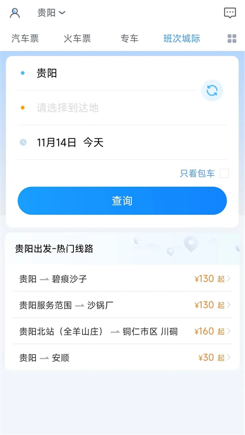 1、贵州好行app支持在主页立即查询到服务平台的一些公示信息,随时随地查询公示详细信息; 2、贵州好行app能够为用户查询汽车票、火车票和动车票的票务中心信息; 3、能够随意的键入起始点和终点站来开展迅速的查询到; 4、在查询的情况下能够随意的选择必须查询的时间,查询更为随意; 5、贵州好行app能够为用户提供车票的门票、里程数时间这些信息; 6、查询单程车票以后还能够线上查询到返程车票。贵州好行怎么用