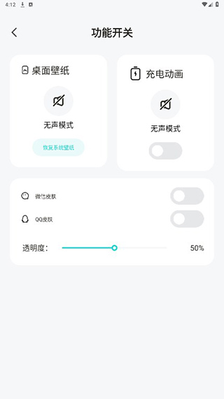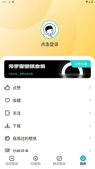 用户点击我的,进入个人中心,点击功能开关,即可进行壁纸和充电动画的设置。