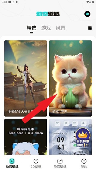 用户点击下方动态壁纸,即可看到许多惟妙惟肖的动态壁纸,有精选、游戏、风景三大类供你选择。