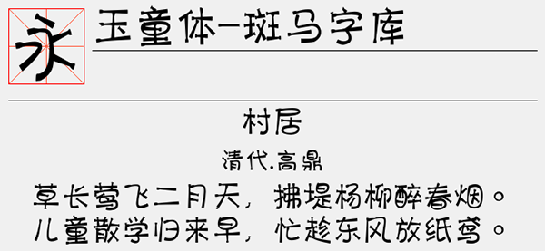 斑马玉童体字体是一款让人赏心悦目、百看不厌的中文字体,字体采用粗字体打造,字距设计恰当,整体结构协调一致,视觉效果非常的出色,识别性很强。笔触写得很流畅,形状很方正,看起来很传统且正规,并它还有一点点装饰,其字体的整体形象设计得非常恰当,整体效果极佳。可以很好的应用于文本装潢、信息展示、网页设计、篆刻制模、数据制作、装潢设计、计算艺术设计、视觉设计、字帖等一切合法应用场景,有喜欢的朋友可免费下载收藏。